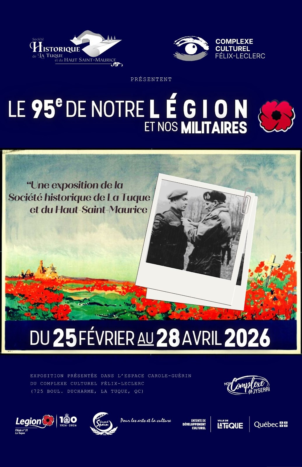 Le Complexe culturel Félix-Leclerc et la Société historique de La Tuque et du Haut-St-Maurice unissent leurs forces pour une cinquième année consécutive afin de présenter une nouvelle exposition : Le 95e de notre Légion et nos militaires. L'exposition sera présentée dans l’Espace Carole-Guérin du Complexe culturel Félix-Leclerc du 25 février au 28 mars 2026. Un vernissage aura lieu le mercredi 25 février à compter de 16 h avec la présence de plusieurs membres de la Légion Royale Canadienne (Filiale 31) de La Tuque.